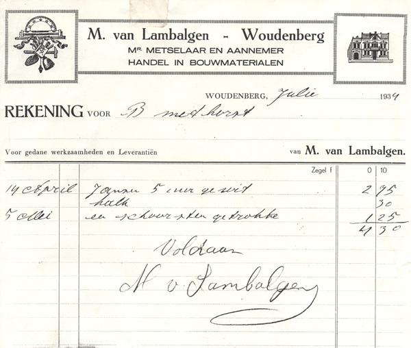 In 1912 start Marinus van Lambalgen een timmer- en metselbedrijf aan de Stationsweg 62 in Woudenberg.